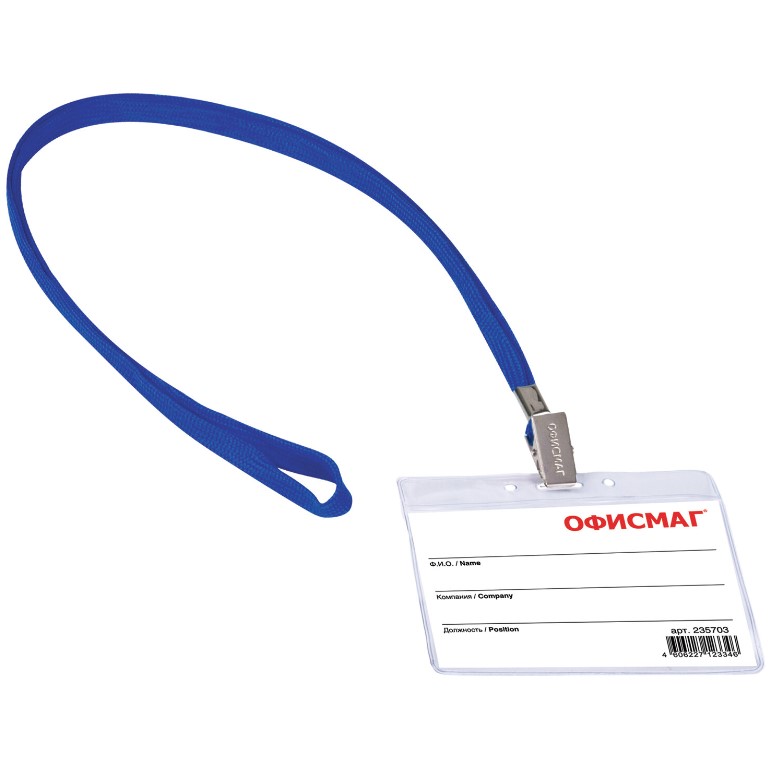 —Бейдж горизонтальный Офисмаг 60х90 мм, на синей ленте 45 см, 235703