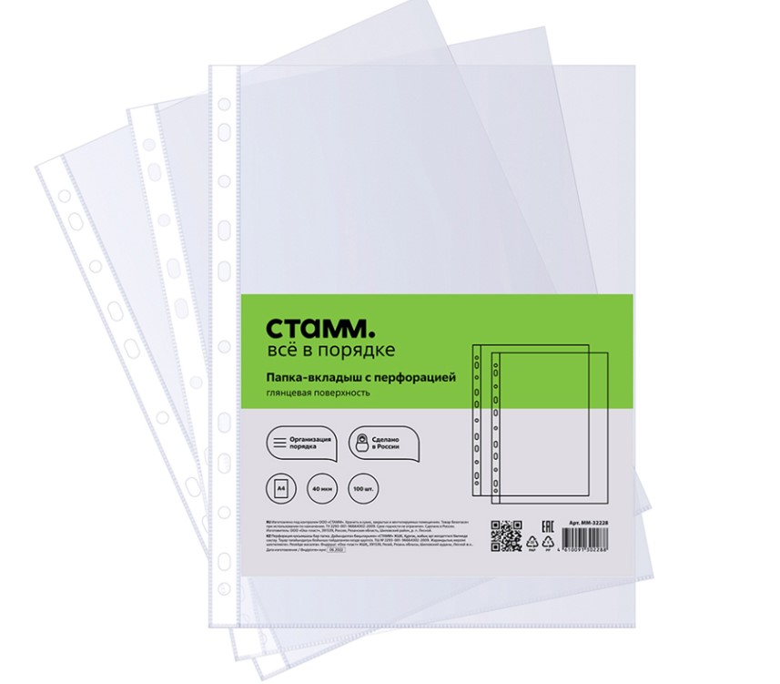 Папка-вкладыш с перфорацией (файл) СТАММ А4, 40мкм, глянцевая, (100 шт/уп), ММ-32228