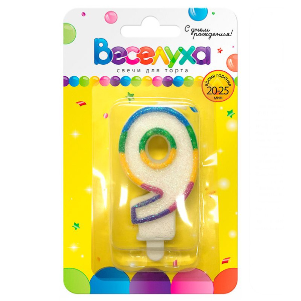 —Свеча тортовая цифра 9, "Разноцветный градиент" с глиттером, 620086-9