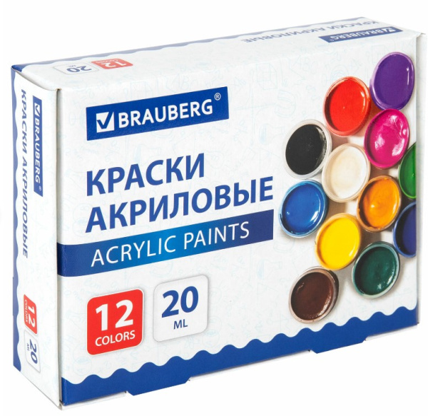 —Краски акриловые для рисования, BRAUBERG, 12 цветов, по 20 мл, 192564